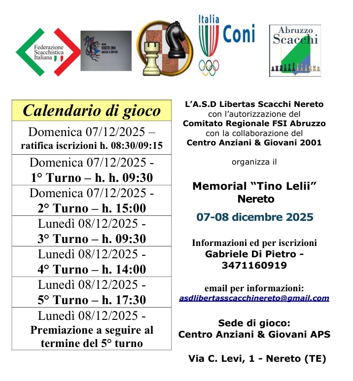 Evento | Torneo | Data | Citta' | Memorial "Tino Lelii" | 07/12/25 - 08/12/25 | Nereto (TE)